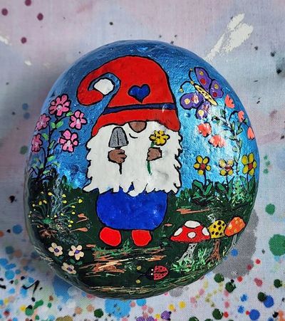 No two rocks are the same and these are just some of my painted rocks. Why do I paint rocks? Because painting is therapeutic for me. I can relax and spend hours painting. Also, they make me smile. On a walk around my neighborhood, I saw a painted rock. It made me smile and lifted my spirits. I was down that day, not feeling very well and the rock gave me some joy. So, I went to YouTube to find out how to paint a rock. That's when I discovered the "Kindness Project." I can understand why it is named that. It is so kind to give someone a little bit of joy, kindness and a smile with a hand painted rock. I have since placed 15 painted rocks around my neighborhood just in case they might give someone a positive feeling or maybe a smile. The garden gnomes are the most popular with friends and family.